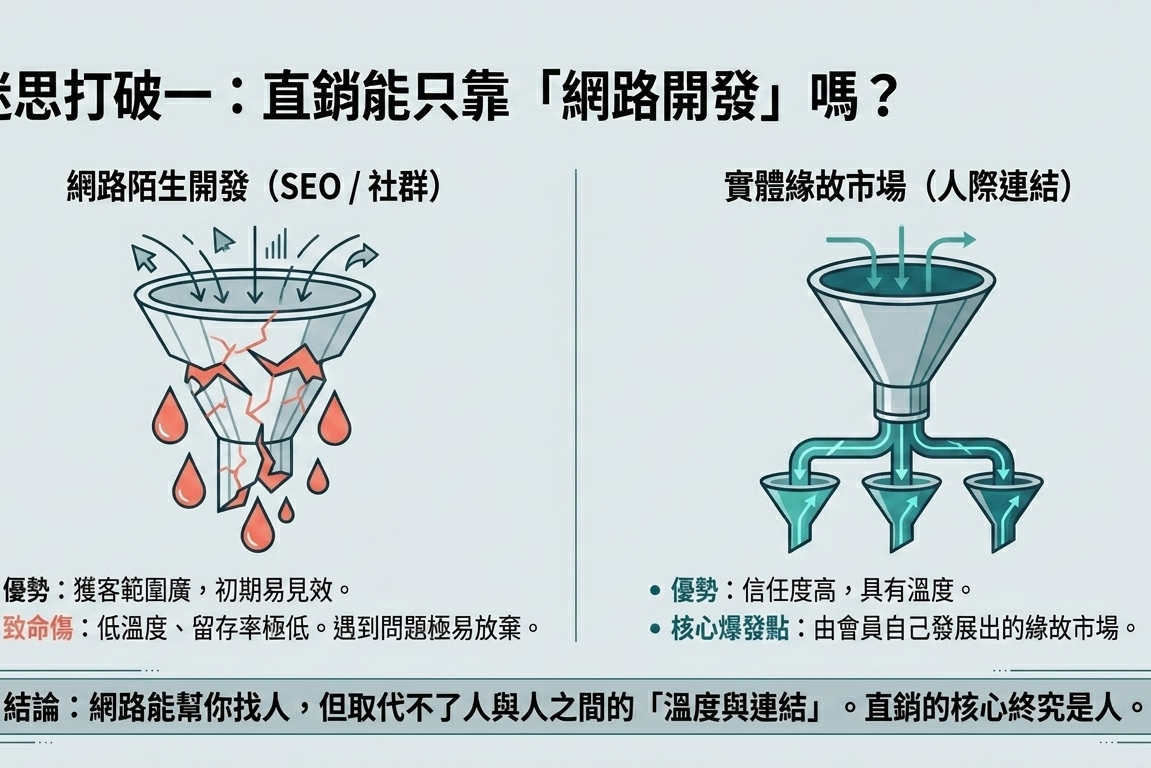 我一開始就用網路經營——寫文章、做 SEO、在社群上分享——這些的確帶來一些新會員,但我發現:透過網路加入的人,留存率遠遠低於透過人際介紹加入的人。